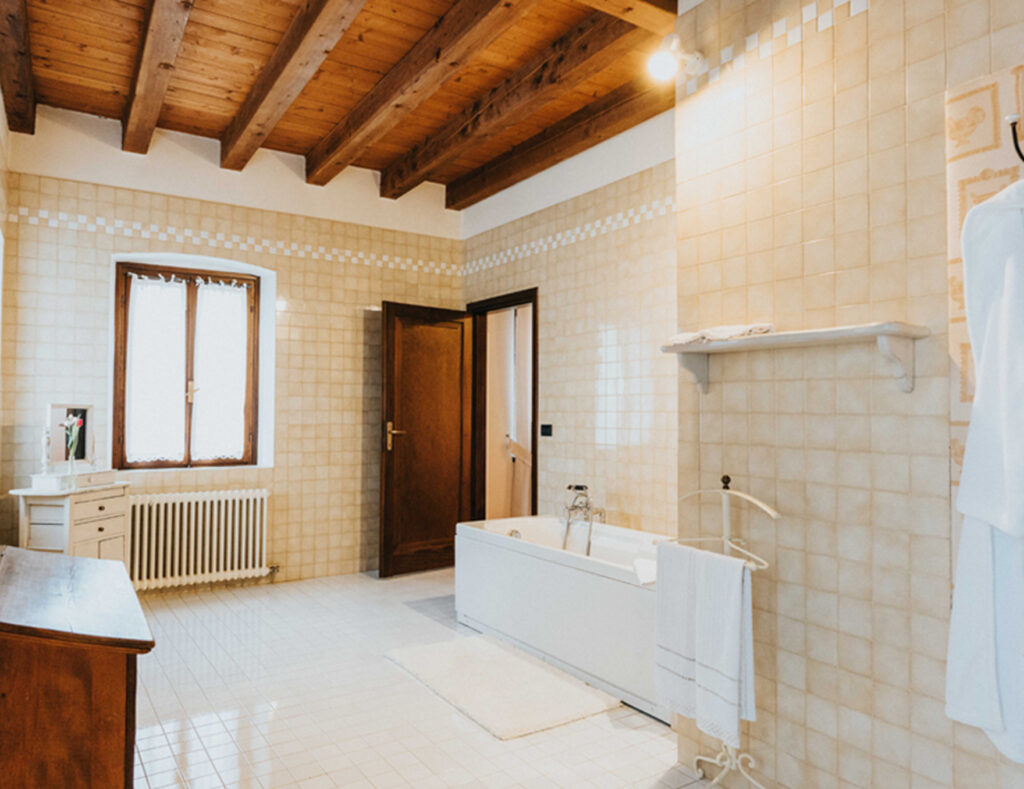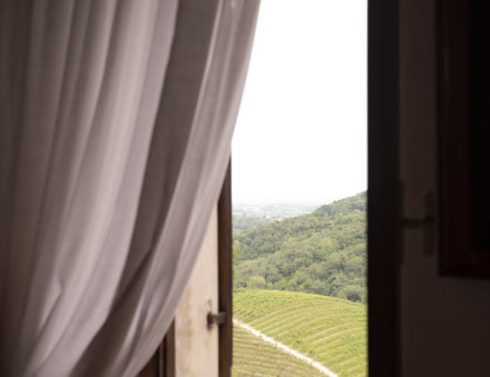 The separate living area leads to a bedroom with a double bed; the large windows, combined with the room’s warm colours that make it even brighter, open onto a breathtaking view of the UNESCO-listed Prosecco hills. The view and the garden below together create a unique sense of tranquillity for guests.